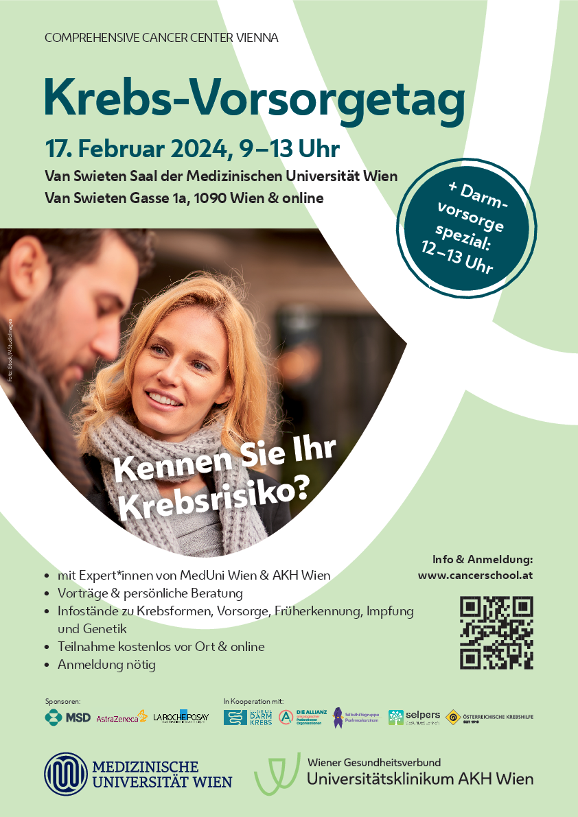 Mit dem Krebs-Vorsorgetag am 17. Februar von 9.00 – 13.00 Uhr im Van Swieten Saal der Medizinischen Universität Wien (1090 Wien, Van-Swieten-Gasse 1a) bietet das CCC der breiten Bevölkerung einen Überblick, welche Angebote hinsichtlich Impfung, Vorsorge, Genetik und Früherkennung zu den verschiedenen Krebsarten bestehen. Dazu versammelt das CCC führende Expert:innen der verschiedensten Fachrichtungen, die der breiten Bevölkerung bei Vorträgen und zur Beratung zur Verfügung stehen. Daran anschließend lädt die Selbsthilfe Darmkrebs Österreich zu einem „Darmvorsorge-Special“, wo man sich über alle aktuellen News zu Vorsorge und Früherkennung dieser Tumorerkrankung bei Ärzt:innen und persönlich betroffenen Patient:innen informieren kann.