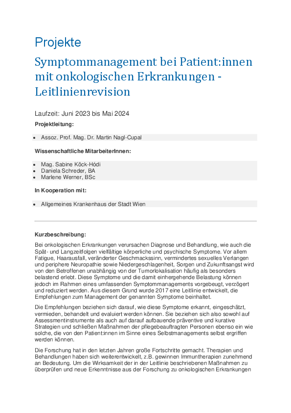 - Symptommanagement bei PatientInnen mit onkologischen Erkrankungen – Entwicklung einer evidenzbasierten Leitlinie
