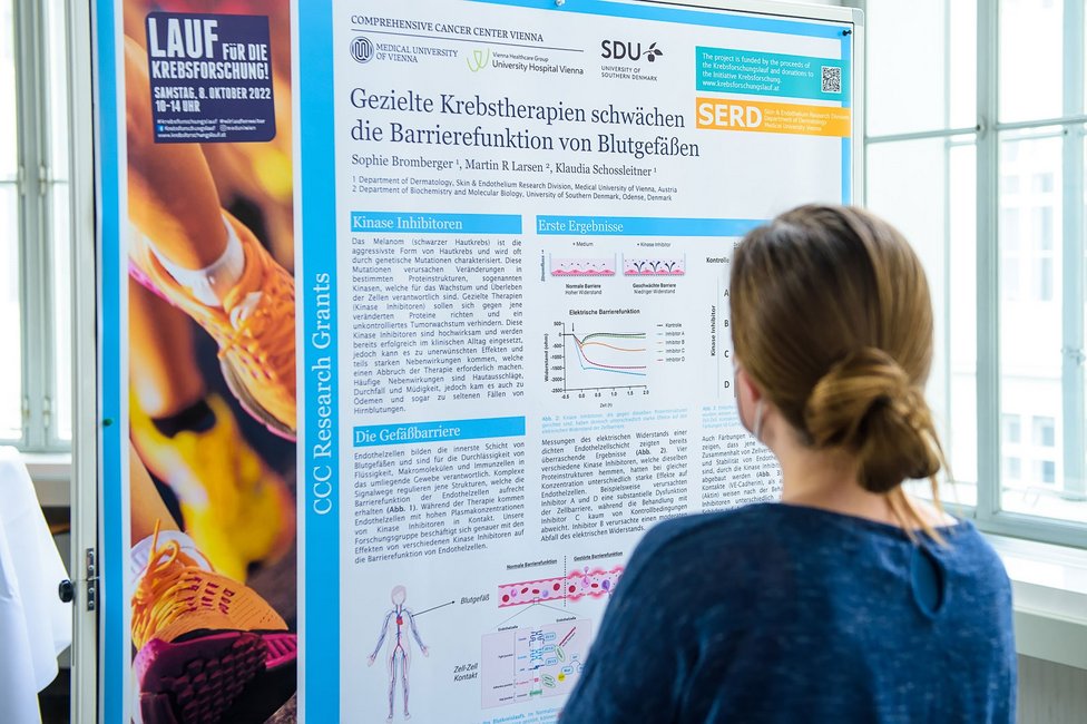 Zielgerichtete Therapien zeigen in der Bekämpfung des malignen Melanoms, also des schwarzen Hautkrebses, große Wirkung. Leider führen vor allem Kinase-Inhibitoren, das sind Arzneistoffe, die das Tumorwachstum hemmen, häufig zu schweren Nebenwirkungen, hervorgerufen durch Schädigungen der Gefäße. Sophie Bromberger untersucht in ihrem Forschungsprojekt, das durch die CCC-Forschungsförderung unterstützt wird, welche zellulären Mechanismen diese unerwünschten Folgeerscheinungen auslösen. Ziel ist es, Erkenntnisse darüber zu gewinnen, wie man Nebenwirkungen eindämmen und Medikamente exakter dosieren kann, damit sie besser verträglich sind. Das könnte dazu führen, dass PatientInnen neue und verbesserte Therapieoptionen zur Verfügung stehen.