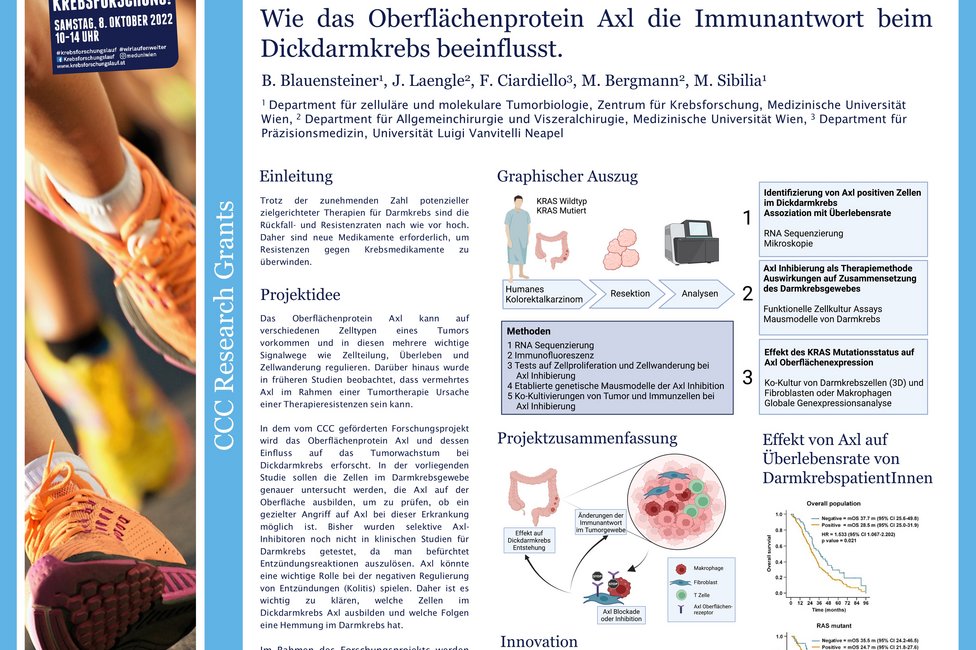 Trotz der zunehmenden Zahl potenzieller zielgerichteter Therapien für Darmkrebs sind die Rückfall- und Resistenzraten nach wie vor hoch. Daher sind neue Medikamente, um Resistenzen gegen Krebsmedikamente zu überwinden, erforderlich. Bernadette Blauensteiner, Zentrum für Krebsforschung der MedUni Wien und Mitglied des Comprehensive Cancer Center (CCC) Vienna von MedUni Wien und AKH Wien, erforscht im vom CCC geförderten Forschungsprojekt, wie das Oberflächenprotein Axl das Tumorwachstum beeinflusst. In der vorliegenden Studie hofft sie aufzuklären, welche Zellen im Darmkrebsgeschehen Axl exprimieren (auf der Oberfläche ausbilden), um zu prüfen, ob ein gezielter Angriff auf Axl bei dieser Erkrankung möglich ist. Bisher wurden selektive Axl-Inhibitoren noch nicht in klinischen Studien für Darmkrebs getestet, da man befürchtet, dass sie schwerwiegende Entzündungsreaktionen auslösen könnten.