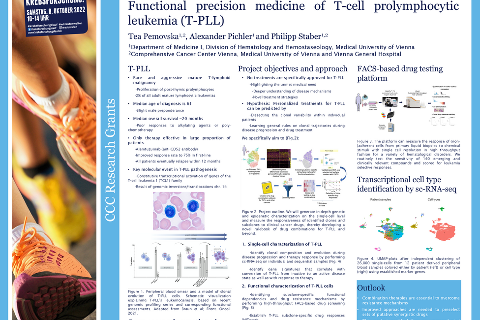 T-PLL ist eine seltene Form der Leukämie, die besonders behandlungsresistent ist. Sie zeichnet sich durch eine hohe Heterogenität aus: Das heißt, neben den Tumorzellen und deren Klone sind noch eine Reihe anderer Zellen, zum Beispiel B-Zellen und Monozyten, im Spiel. Tea Pemovska, Molekularbiologin an der Universitätsklinik für Innere Medizin I und Mitglied des Comprehensive Cancer Center (CCC) von MedUni Wien und AKH Wien, erforscht in ihrem Projekt, das mit der CCC Forschungsförderung unterstützt wird, wie die zelluläre Zusammensetzung des Tumors aussieht, welche Rolle die Klone der einzelnen Zelltypen spielen und wie sie das Tumorgeschehen beeinflussen. Das Wissen darüber könnte nicht nur das Fortschreiten der Erkrankung erklären, sondern auch warum Betroffene nur schlecht auf bestehende Therapiemöglichkeiten ansprechen. Das Ziel ist, wissenschaftliche Grundlagen für spezifischere und daher effektivere Therapiekombinationen zu entwickeln.