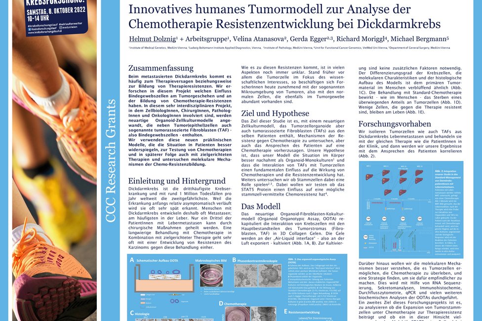 Beim Dickdarmkrebs im metastasierten Stadium kommt es häufig zum Therapieversagen beziehungsweise zur Bildung von Therapieresistenzen. Helmut Dolznig, Molekularbiologe am Institut für Medizinische Genetik und Mitglied des Comprehensive Cancer Center von MedUni Wien und AKH Wien, forscht am Anteil, den Bindegewebszellen am Tumorgeschehen und an der Bildung von Chemotherapie-Resistenzen haben. In seinem sehr interdisziplinär aufgesetzten Projekt, das durch die CCC-Forschungsförderung unterstützt wird, entwickelt er neuartige Organoid-Zellkulturmodelle, die neben Tumorepithelzellen auch Bindegewebszellen enthalten.