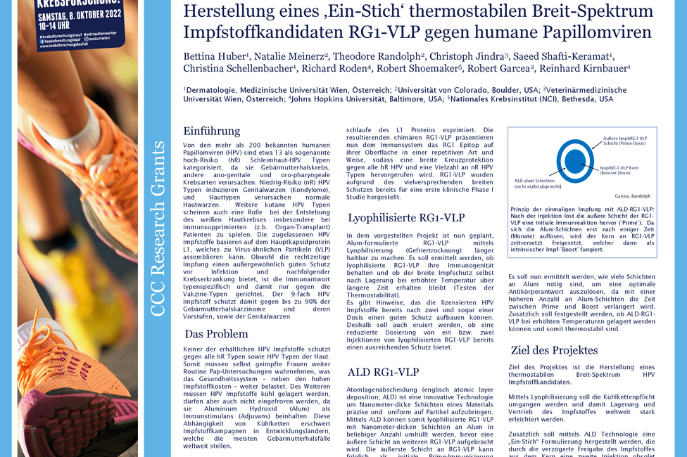 Der derzeit häufig genutzte nonavalente Impfstoff gegen Infektionen mit Humanen Papillomaviren (HPV) schützt gegen neun Hochrisikovirentypen und gegen zwei Niedrigrisikotypen, und damit vor der Entstehung von etwa 90 Prozent der Gebärmutterhalskarzinome (Zervixkarzinome) und deren Vorstufen sowie gegen Genitalwarzen (Kondylome). Ein neuartiger experimenteller HPV-Impfstoff, der gegen alle 13 Hochrisiko- und eine Vielzahl an Mittel- und Niedrigrisikotypen schützen soll, wird demnächst in einer ersten klinischen Studie geprüft. Beide Impfstoffe müssen gekühlt gelagert werden, dürfen aber keinesfalls tiefgefroren werden. Außerdem sind zwei bis drei Teilimpfungen zum Erreichen des optimalen Schutzes nötig. Beides macht die Impfstoffe teuer. Bettina Huber untersucht nun, wie man den Impfstoff hitzestabil machen und auf nanomolekularer Ebene so strukturieren kann, dass er eine Depotwirkung entfaltet. So könnte ein Stich ausreichend sein, was die Transport- und Lagerungslogistik vereinfachen und die Kosten reduzieren könnte. Vor allem in Entwicklungsländern, die die Hauptlast der Zervixkarzinome weltweit tragen, wäre dies ein entscheidender Fortschritt für erfolgreiche Impfkampagnen.