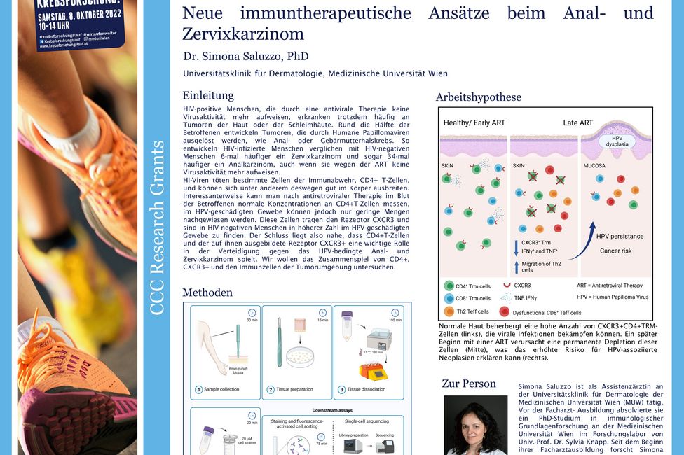 HIV-positive Menschen, die durch eine antivirale Therapie (ART) keine Virusaktivität mehr aufweisen, erkranken trotzdem häufig an Tumoren der Haut oder der Schleimhäute. Rund die Hälfte der Betroffenen entwickeln Tumoren, die durch Humane Papillomaviren ausgelöst werden, wie Anal- oder Gebärmutterhalskrebs. Simona Saluzzo, Universitätsklinik für Dermatologie und Mitglied des Comprehensive Cancer Center (CCC) von MedUni Wien und AKH Wien, erforscht in ihrer vom CCC geförderten Arbeit die Mechanismen, die dahinterstehen. Ihr Ziel ist es, neue immuntherapeutische Ansätze gegen das Analkarzinom und den Gebärmutterhalskrebs (Zervixkarzinom) zu entwickeln.