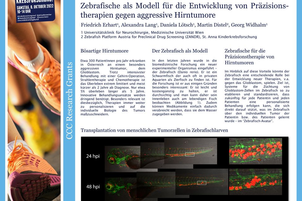 Glioblastome zählen zu den häufigsten und aggressivsten Hirntumoren. Pro Jahr werden in Österreich rund 300 PatientInnen mit dieser Erkrankung diagnostiziert. Die Standardtherapie ist die chirurgische Entfernung des Tumors gefolgt von einer Radio-Chemotherapie, wobei die Lebenserwartung beschränkt bleibt: Die meisten der Betroffenen leben nach der Diagnose nicht länger als 20 Monate. Auch die Immuntherapie war bis dato bei der Therapie von Krebserkrankungen des Gehirns nicht erfolgreich. In seinem, mit der CCC-Forschungsförderung ausgezeichneten Projekt, prüft Erhart, ob es möglich ist, Zebrafische als Avatare für PatientInnen zu nutzen, an denen die Wirkung unterschiedlicher, tumorbekämpfender Substanzen ausgetestet werden.