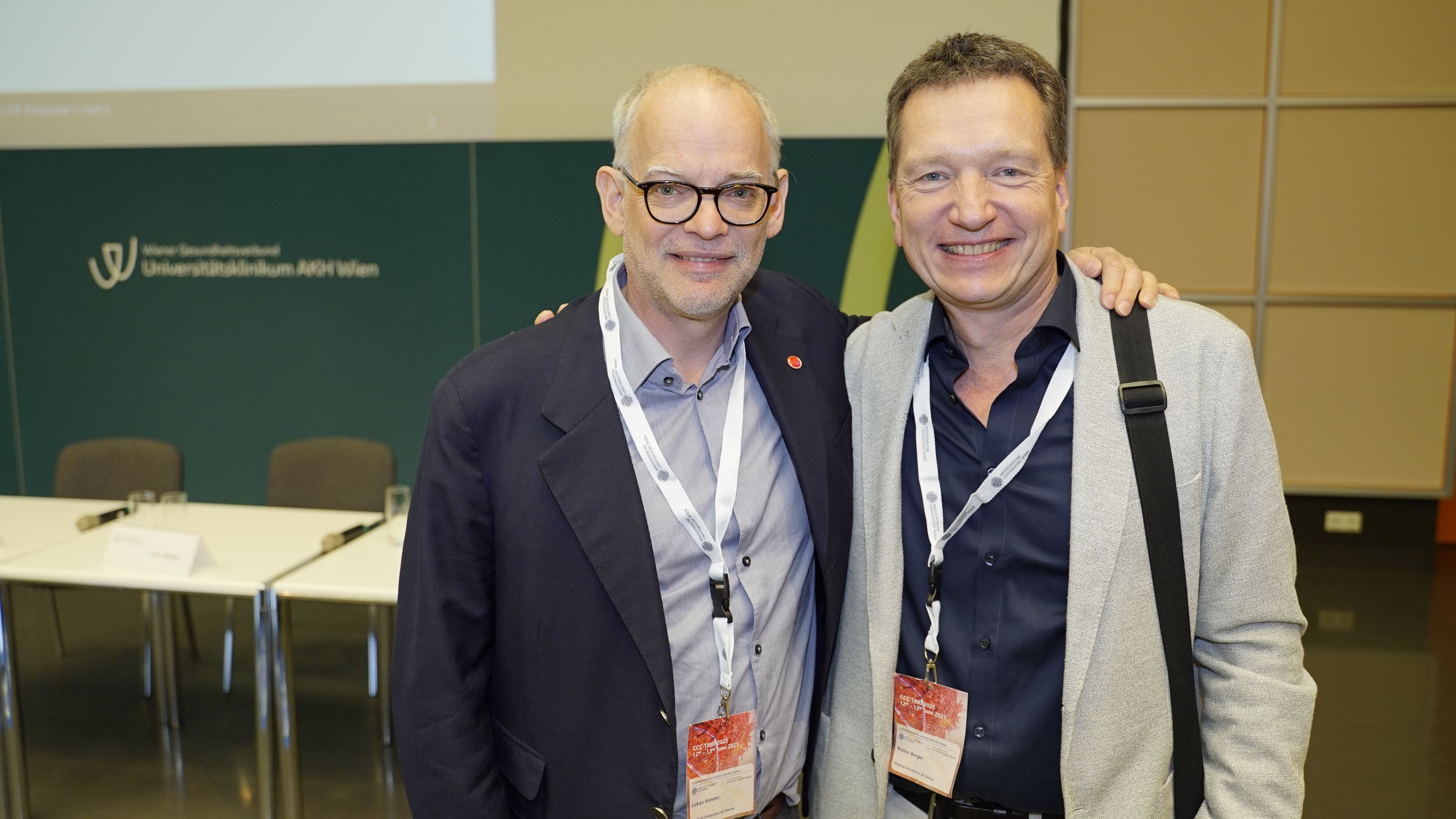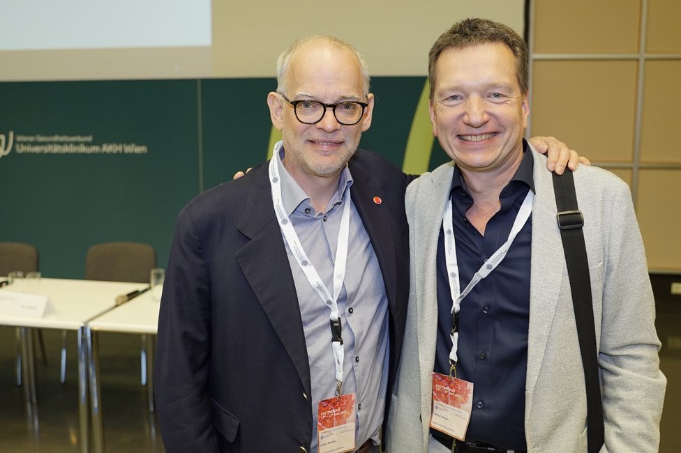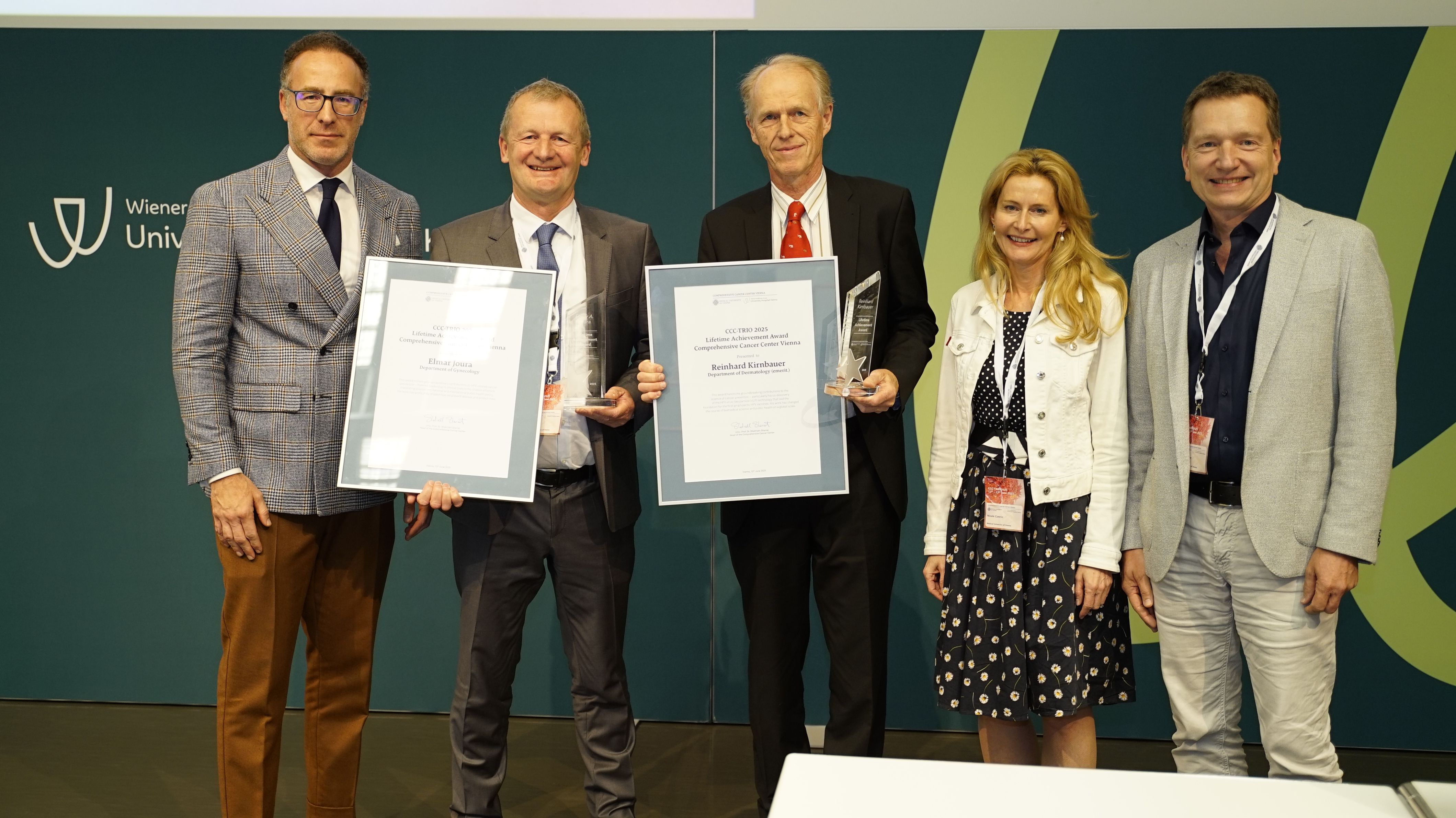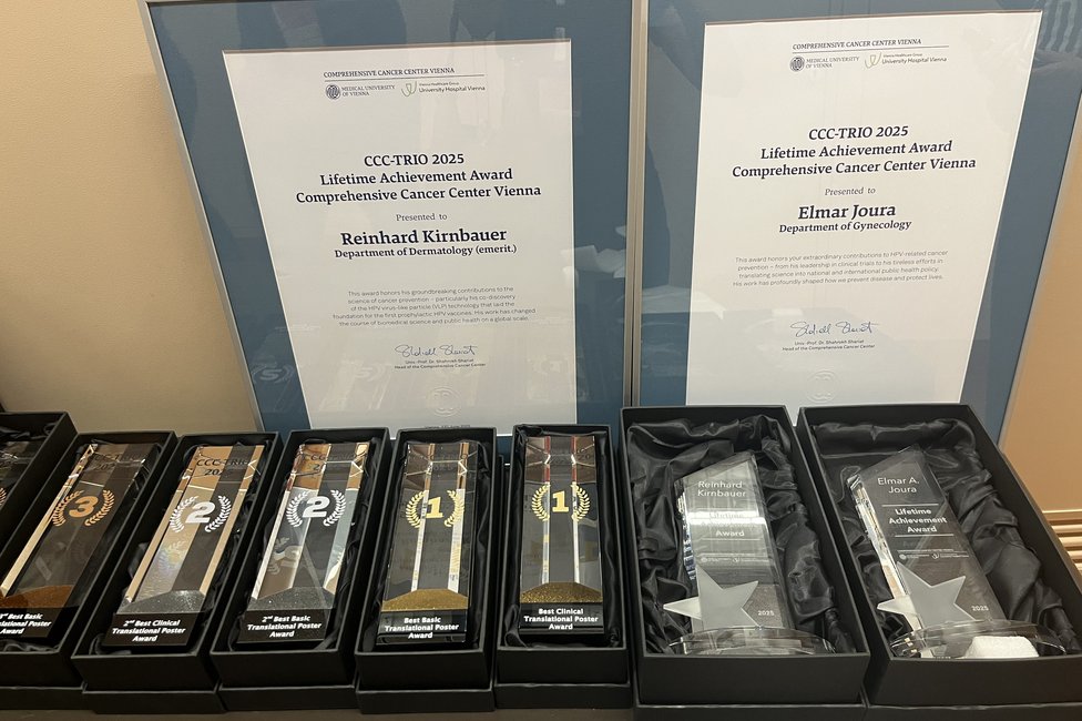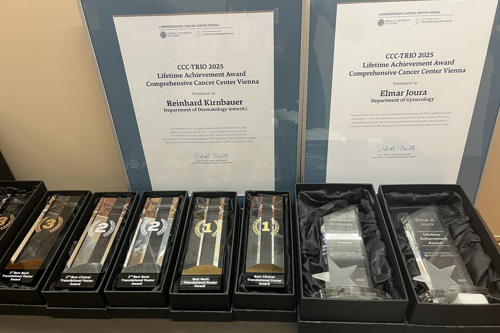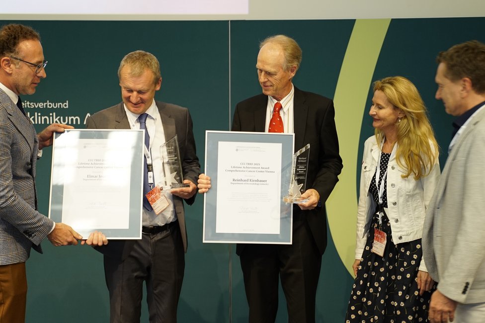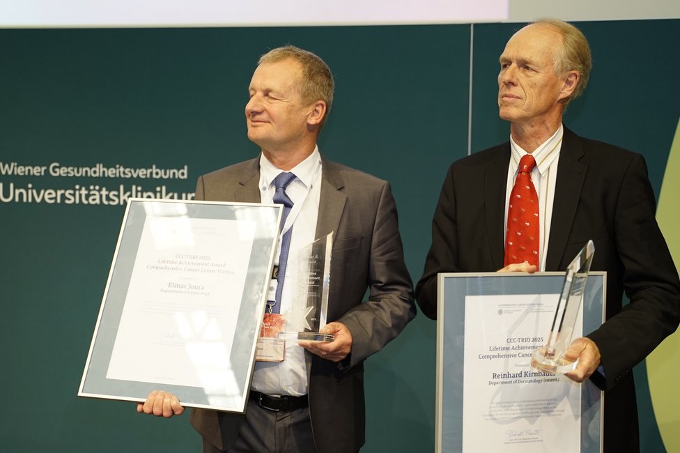 Ein feierlicher Höhepunkt war die Verleihung der CCC Lifetime Achievement Awards 2025. Professor Reinhard Kirnbauer (Universitätsklinik für Dermatologie, emerit.) und Professor Elmar Joura (Universitätsklinik für Frauenheilkunde) wurden für ihre bahnbrechenden Beiträge zur translationalen Krebsforschung ausgezeichnet – insbesondere für die Entwicklung und globale Implementierung des HPV-Impfstoffs, der weltweit hunderttausende Krebsfälle verhindert hat. „Mit Reinhard Kirnbauer und Elmar Joura zeichnen wir zwei Wissenschafter und Mediziner aus, die exzellente translationale Forschung zum Nutzen der Menschen geleistet und damit Medizingeschichte geschrieben haben“, erklärt Shahrokh Shariat, Leiter des CCC Vienna. „Dank ihrer Arbeit ist es heute möglich, sechs verschiedene Krebsarten durch eine Impfung zu verhindern – darunter Gebärmutterhals-, Vulva-, Anal- und Peniskarzinome sowie Rachenkrebs. Das ist ein Meilenstein in der Krebsmedizin.“