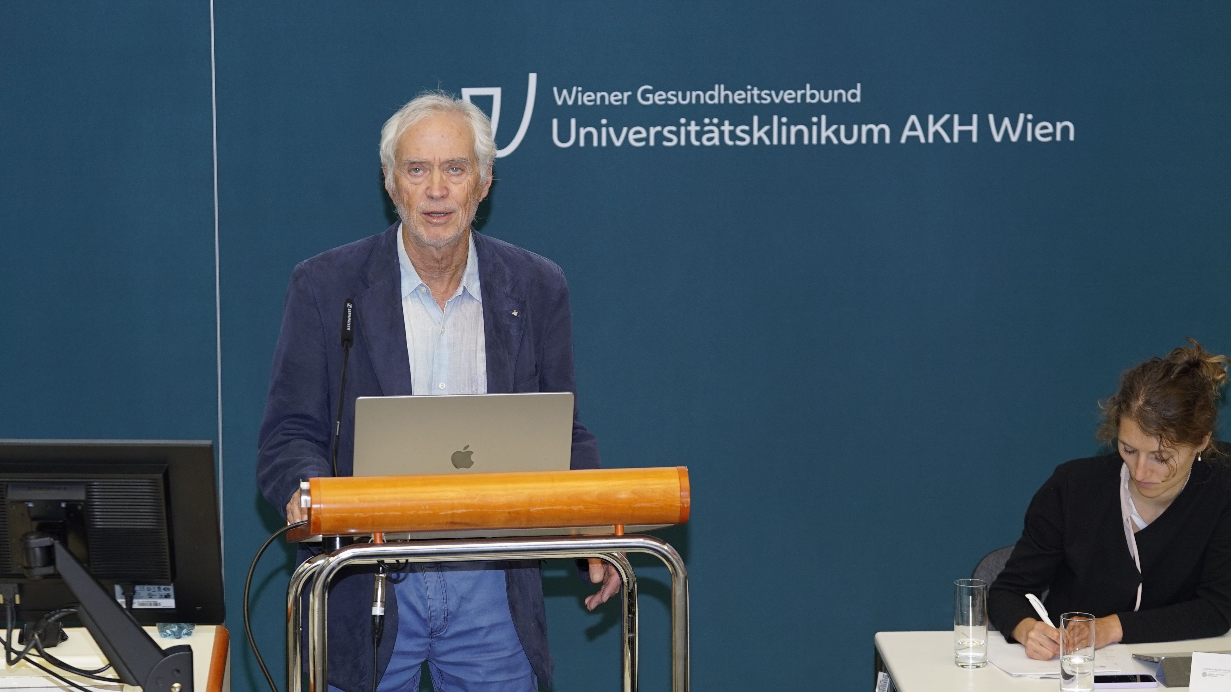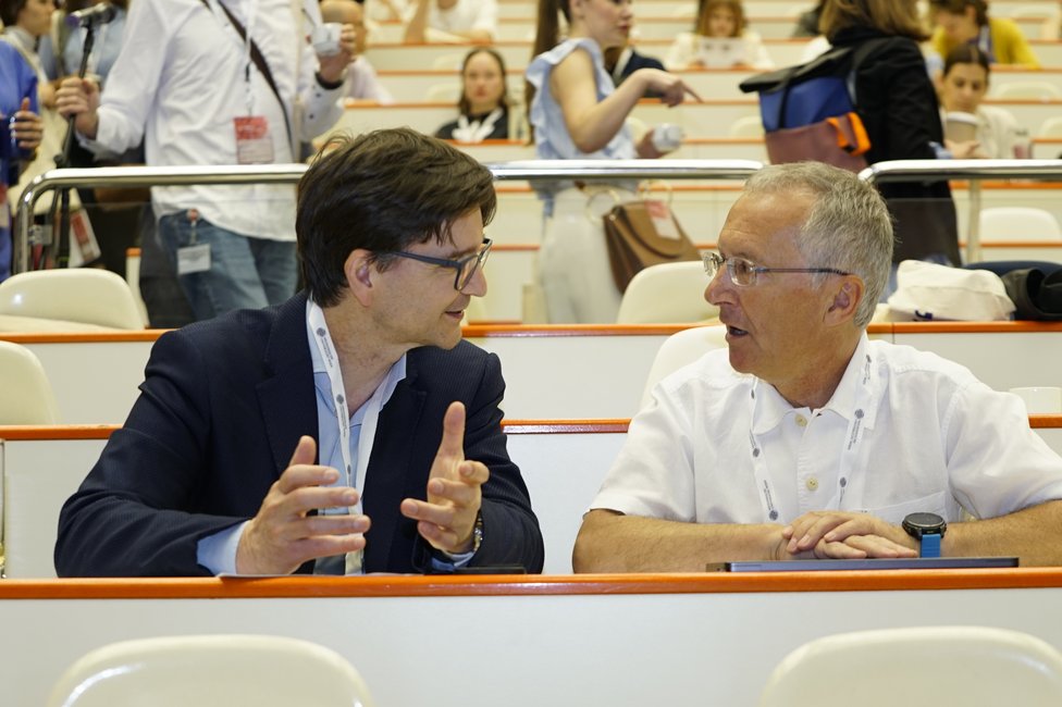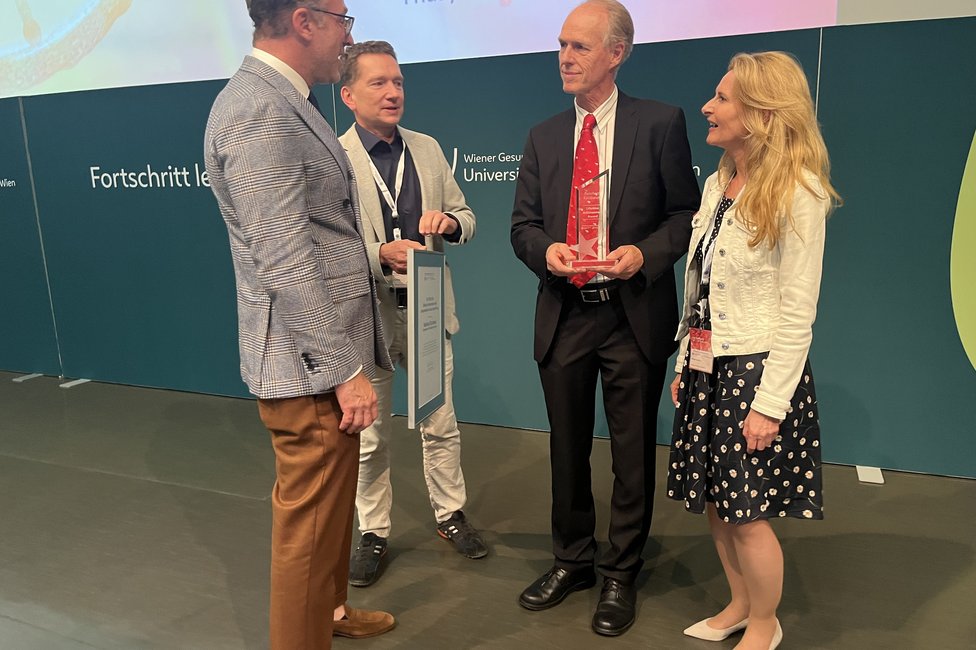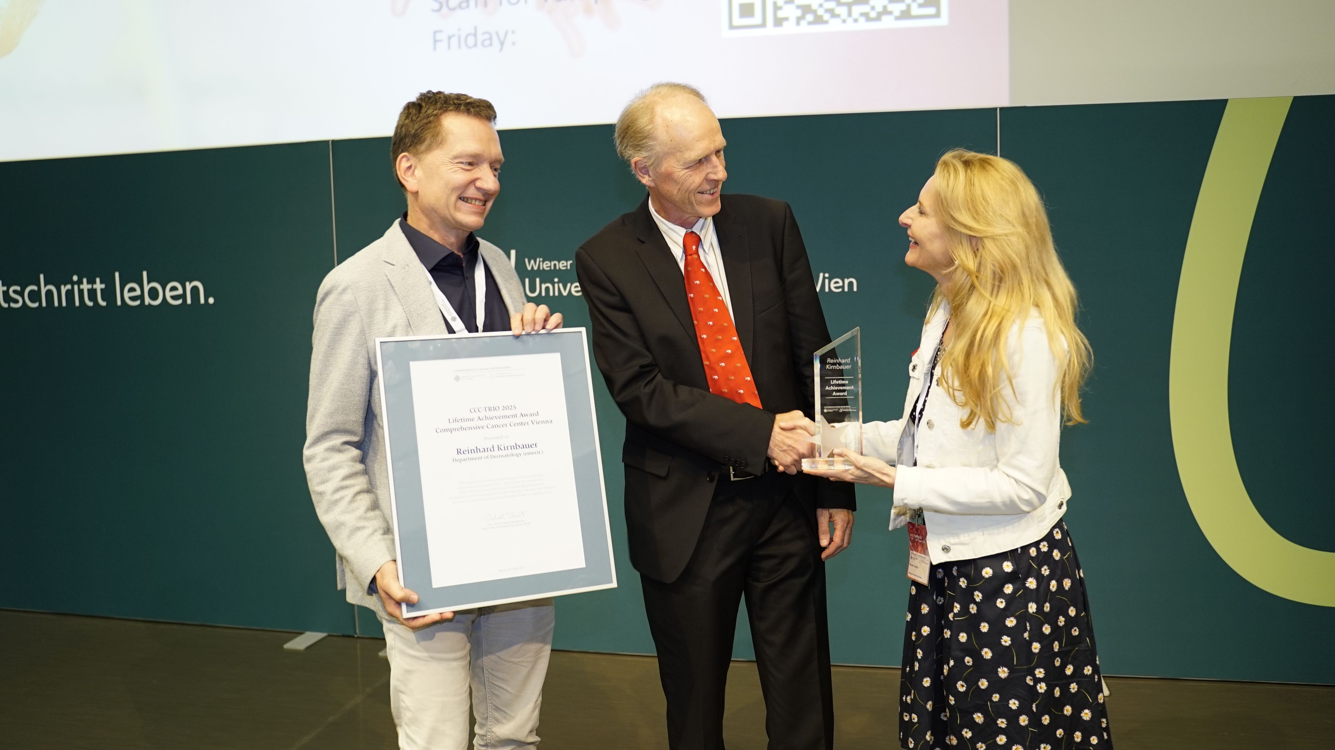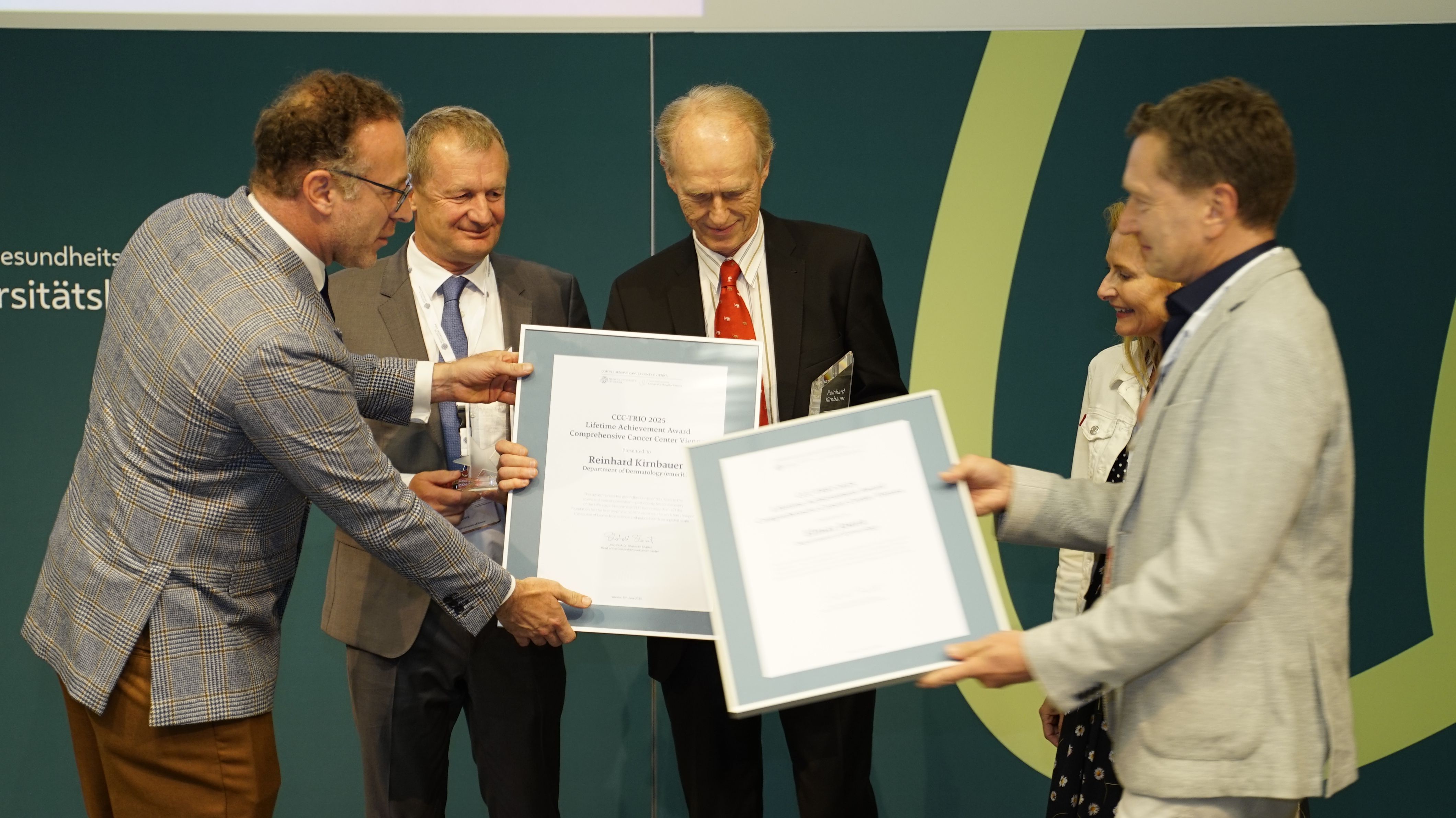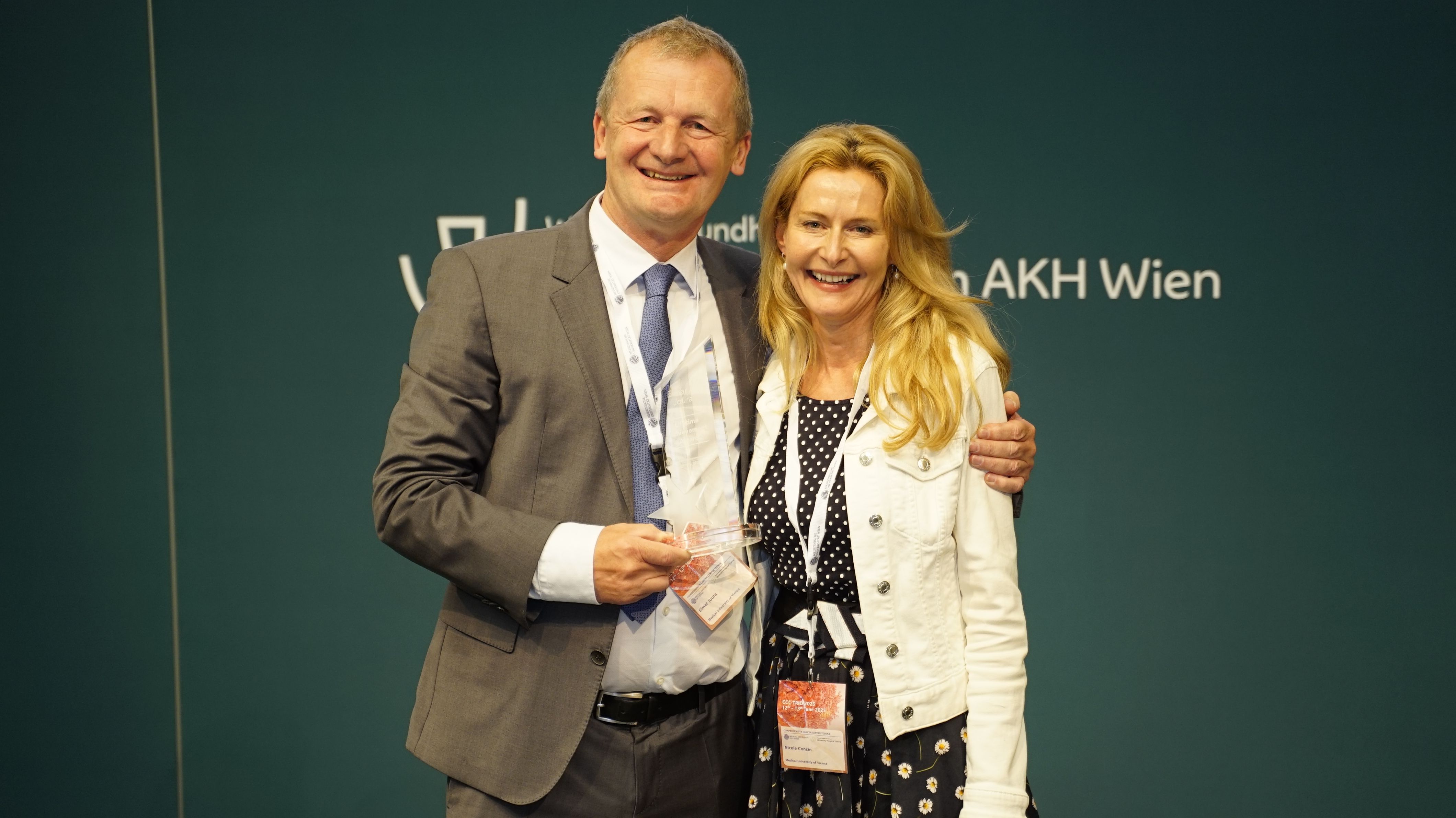 Ein feierlicher Höhepunkt war die Verleihung der CCC Lifetime Achievement Awards 2025. Professor Reinhard Kirnbauer (Universitätsklinik für Dermatologie, emerit.) und Professor Elmar Joura (Universitätsklinik für Frauenheilkunde) wurden für ihre bahnbrechenden Beiträge zur translationalen Krebsforschung ausgezeichnet – insbesondere für die Entwicklung und globale Implementierung des HPV-Impfstoffs, der weltweit hunderttausende Krebsfälle verhindert hat. „Mit Reinhard Kirnbauer und Elmar Joura zeichnen wir zwei Wissenschafter und Mediziner aus, die exzellente translationale Forschung zum Nutzen der Menschen geleistet und damit Medizingeschichte geschrieben haben“, erklärt Shahrokh Shariat, Leiter des CCC Vienna. „Dank ihrer Arbeit ist es heute möglich, sechs verschiedene Krebsarten durch eine Impfung zu verhindern – darunter Gebärmutterhals-, Vulva-, Anal- und Peniskarzinome sowie Rachenkrebs. Das ist ein Meilenstein in der Krebsmedizin.“